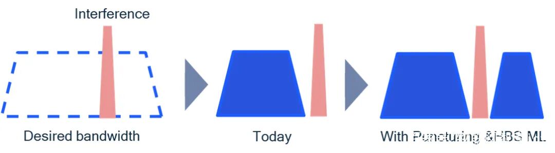 当用户已经占用一部分信道的带宽时,比如20MHz或40MHz,通常会阻止AP使用这个频段,造成一定程度的浪费。针对这种情况,Wi-Fi 7采用了一个创新的解决方案,称为“前导码穿孔”,在保证连续信道可用的同时,允许切割网络并避免使用包含干扰信号的部分频谱。虽然总带宽会因穿孔的数量而降低,但仍然能够提供比其他方式更宽的信道。