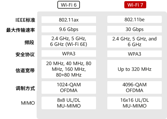 WiFi 7(Wi-Fi 7)是下一代Wi-Fi标准,对应的是IEEE 802.11将发布新的修订标准IEEE 802.11be –极高吞吐量EHT(Extremely High Throughput )。Wi-Fi 7是在Wi-Fi 6的基础上引入了320MHz带宽、4096-QAM、Multi-RU、多链路操作、增强MU-MIMO、多AP协作等技术,使得Wi-Fi 7相较于Wi-Fi 6将提供更高的数据传输速率和更低的时延。Wi-Fi 7预计能够支持高达30Gbps的吞吐量,大约是Wi-Fi 6的3倍。
